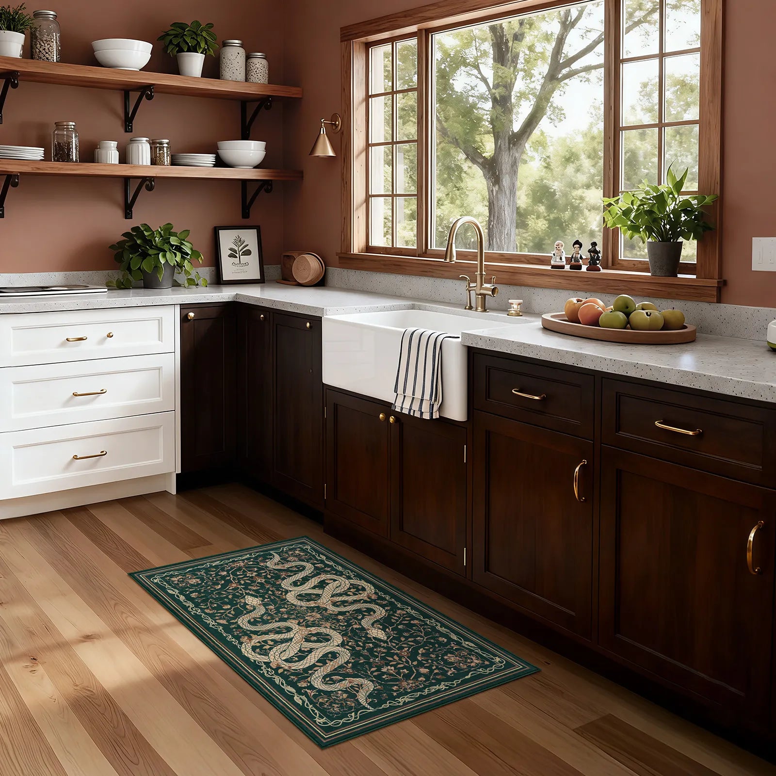 Lahome’s machine-washable kitchen rugs are built for daily use and resist stains, making them suitable for high-traffic areas. Whether dealing with water spills at the sink or food splatters, these rugs clean up easily while maintaining their classic look. With a built-in non-slip backing, they stay securely in place without needing an extra rug pad, offering stability during long cooking sessions. Crafted from eco-friendly, non-toxic materials, they are safe for households with children and pets.