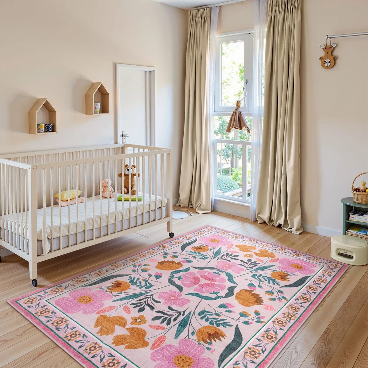 In children’s rooms or nurseries, a pink washable rug works wonderfully by adding a playful, soft, and comforting feel to the space. It’s perfect for creating a nurturing environment for both babies and toddlers. The gentle softness and washable feature make it a practical and safe choice for these areas.