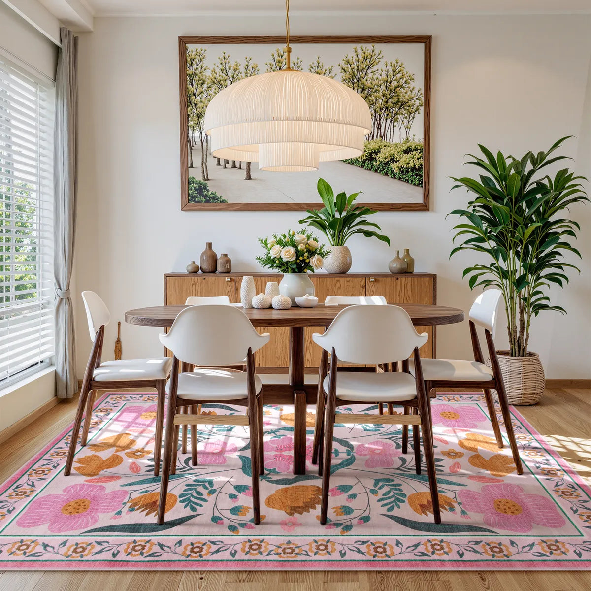 A pink washable rug can also be an excellent addition to dining rooms, especially when paired with modern or minimalist dining tables. Its calming tone pairs beautifully with wood, glass, or white furniture, creating a delicate yet modern aesthetic.