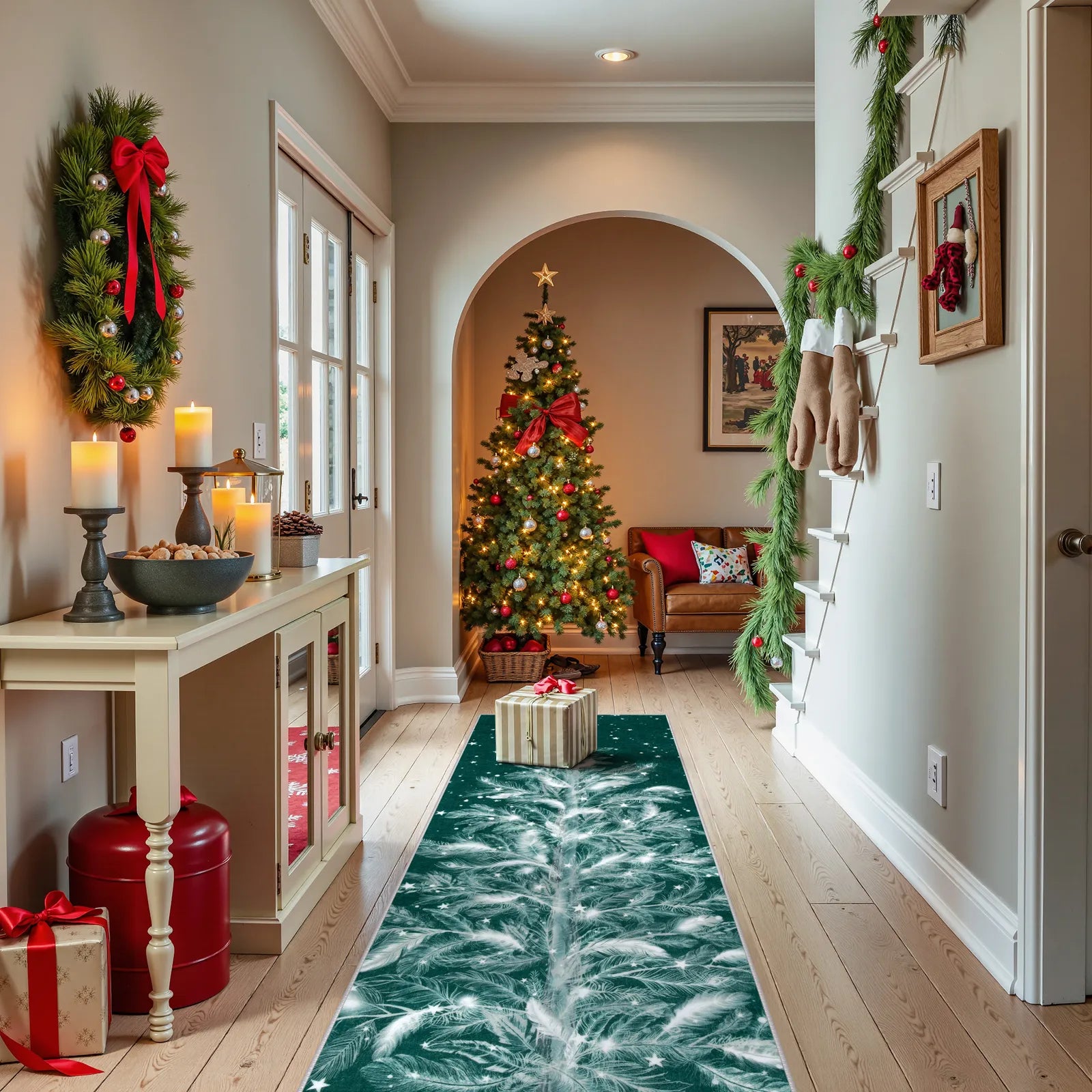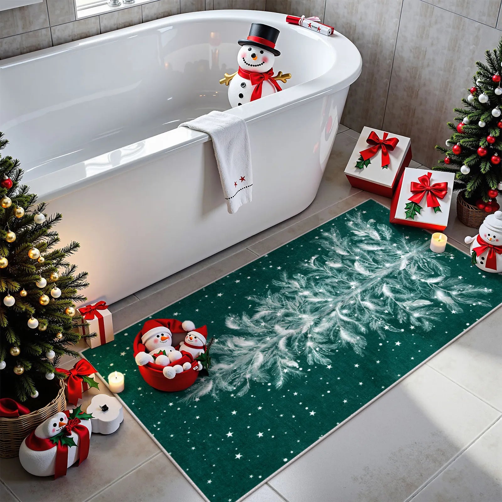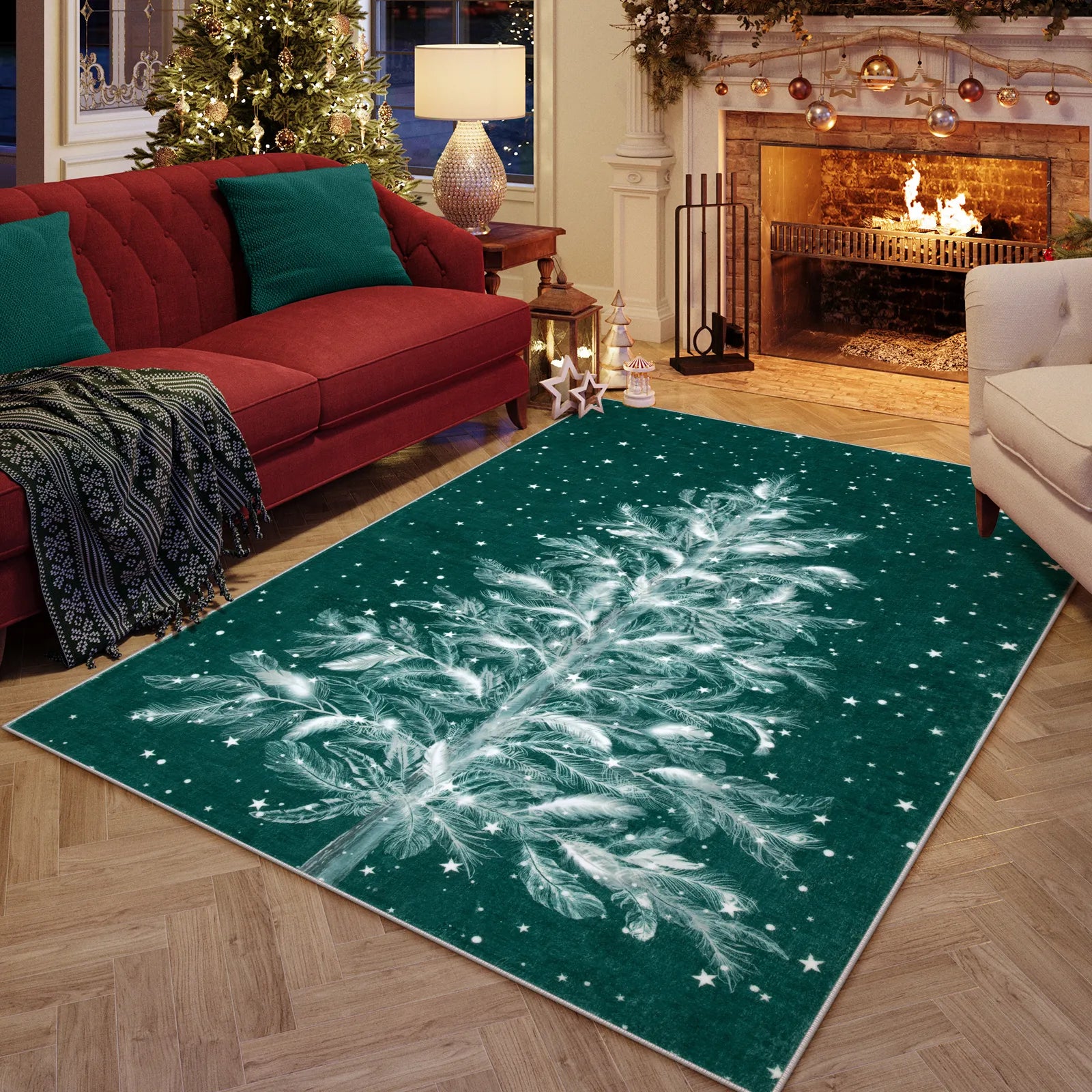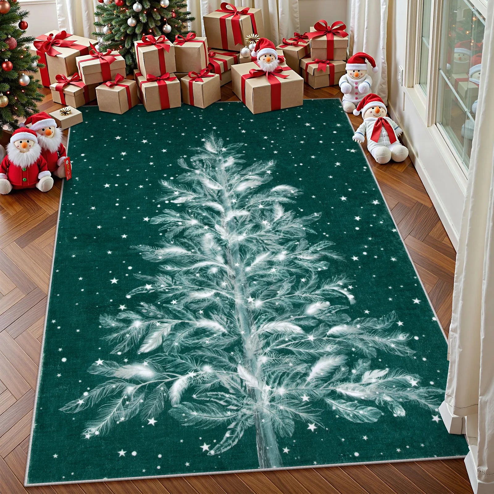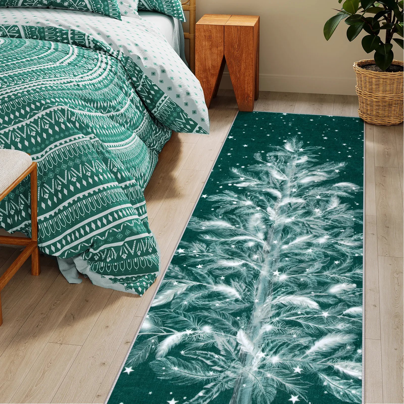 Velours Christmas Washable Tree and Snowflake Green Rug
