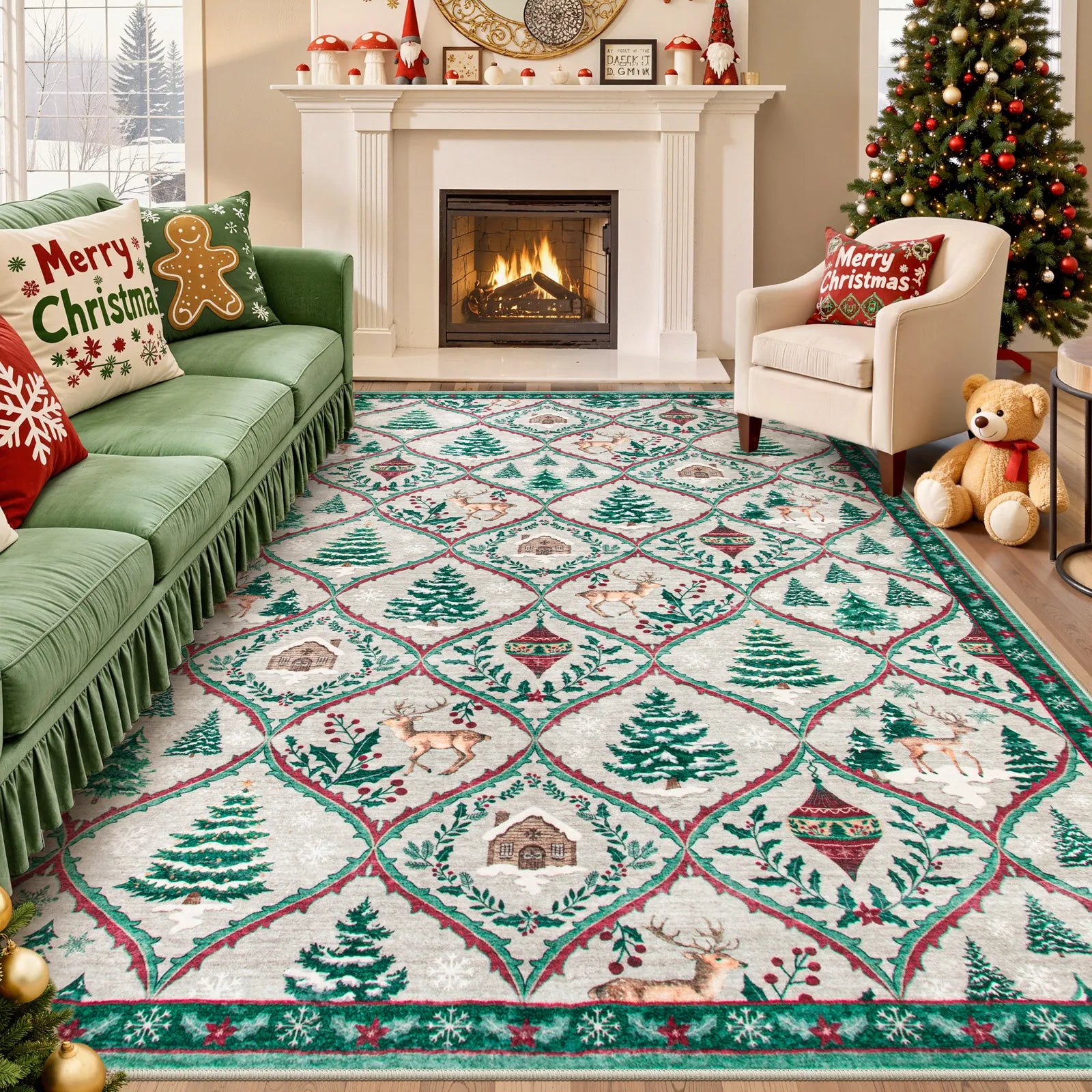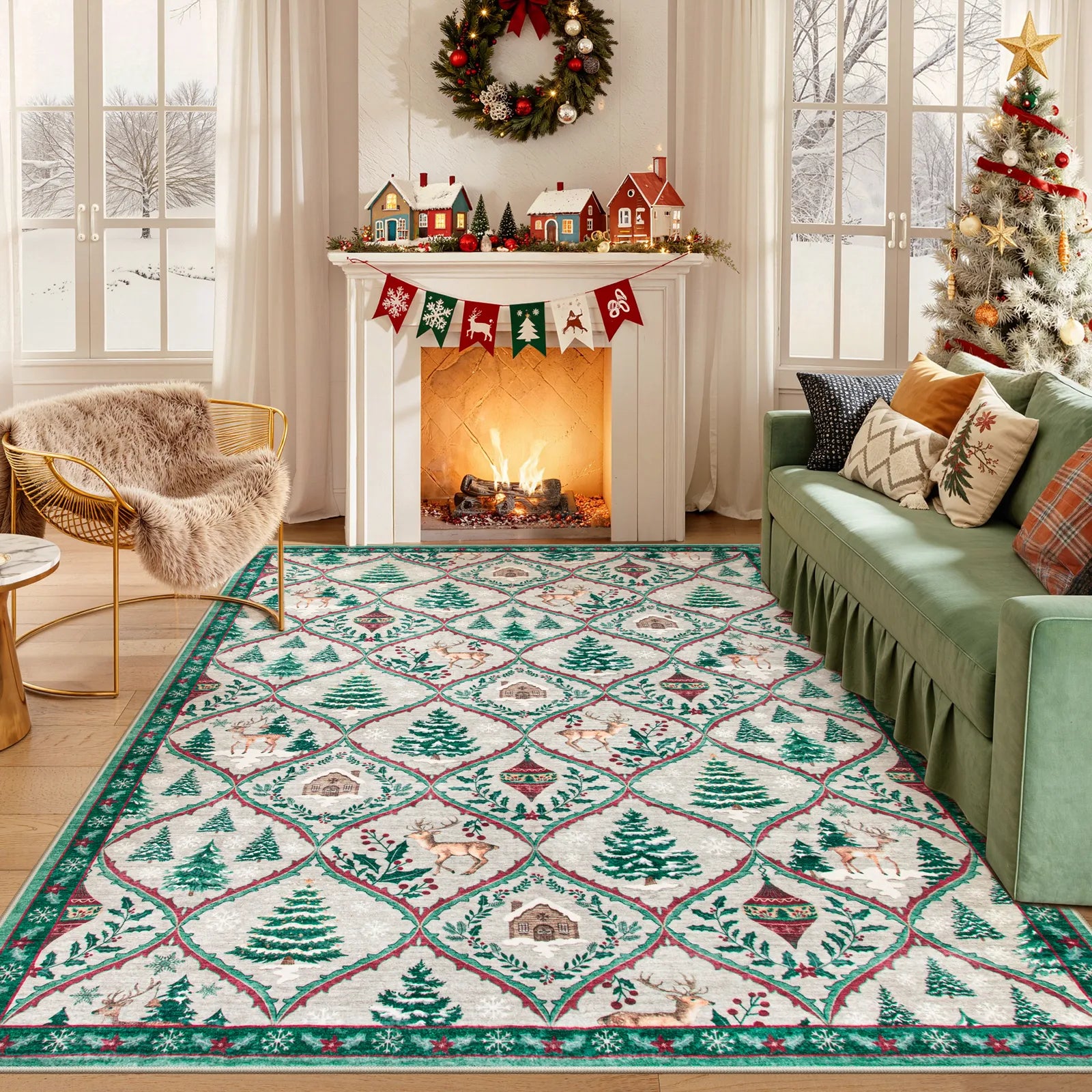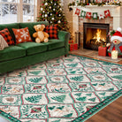 Glace Christmas Washable Tree and Reindeer Green/Beige Rug