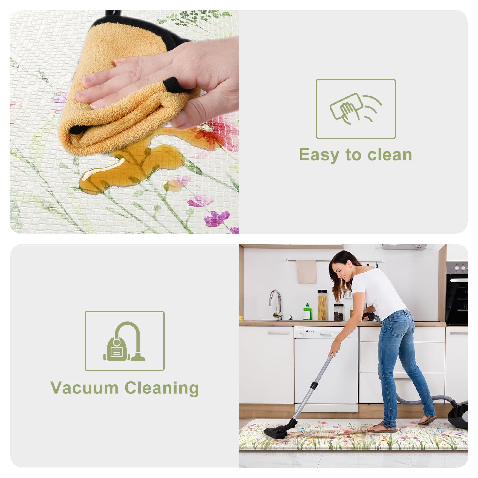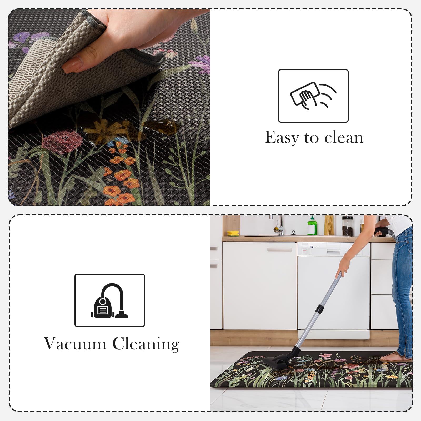 - Easy Care and Clean: Simply vacuum regularly, shake or sweep off debris, and spot clean with a solution of mild detergent and water when needed. Support wipe clean and vacuum clean,air dry and dry flat.This advantage saves you a lot of time in cleaning the mat.
