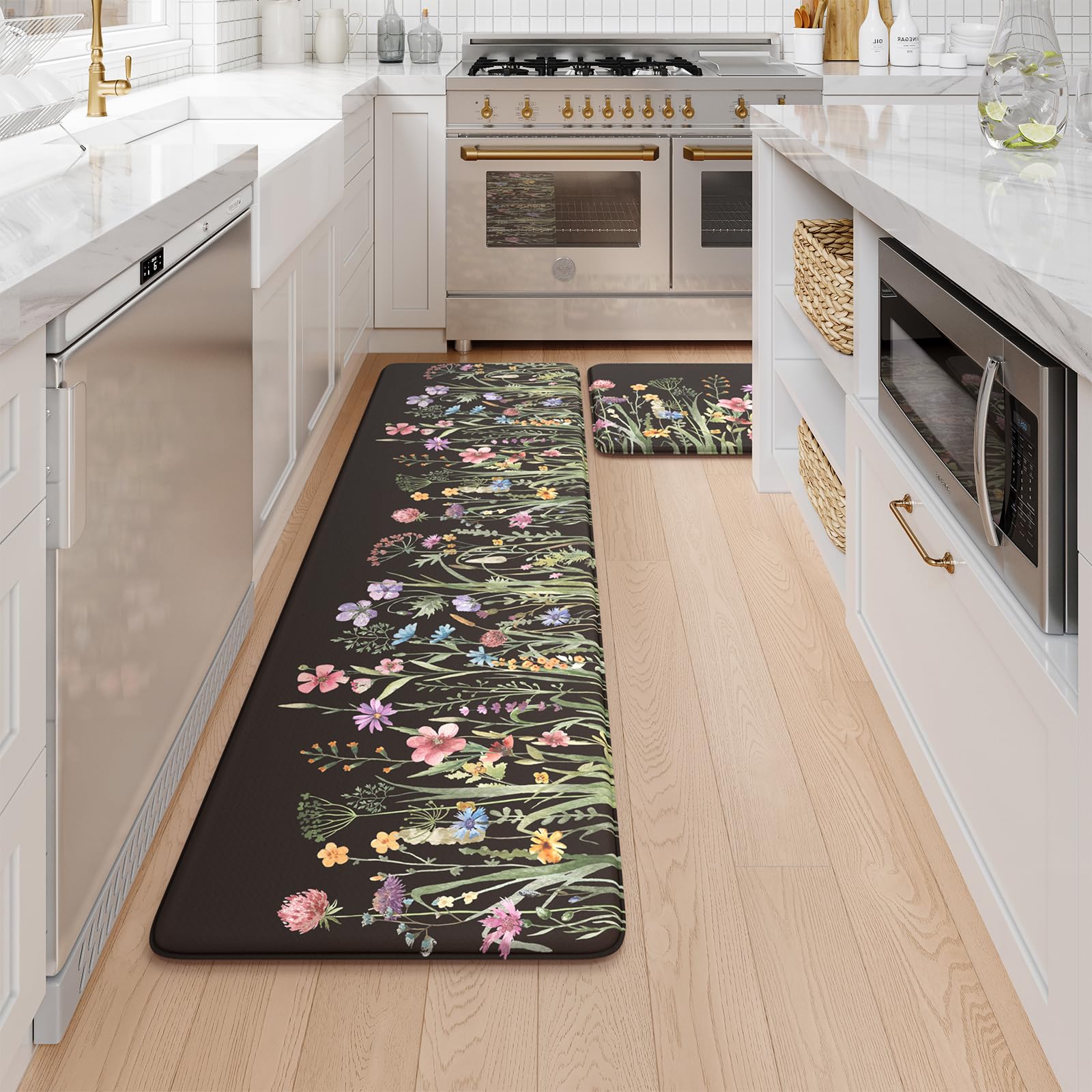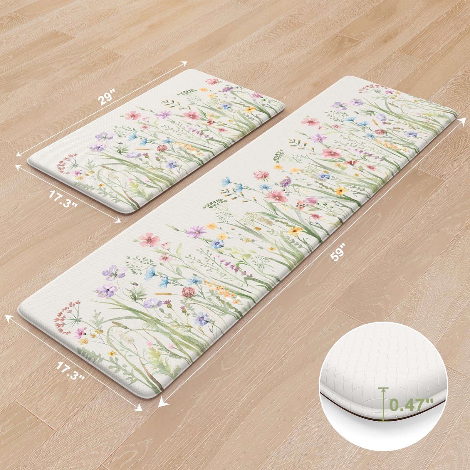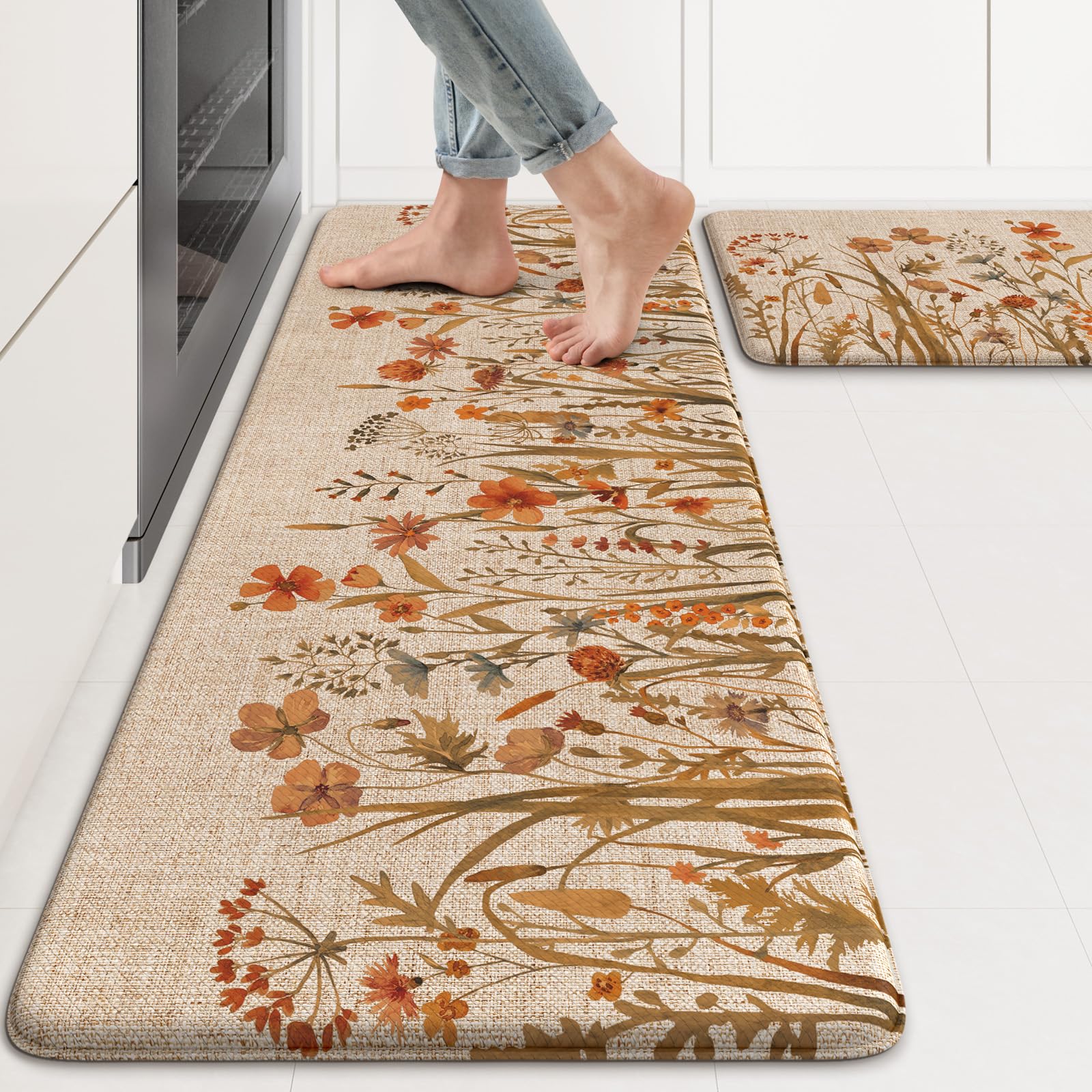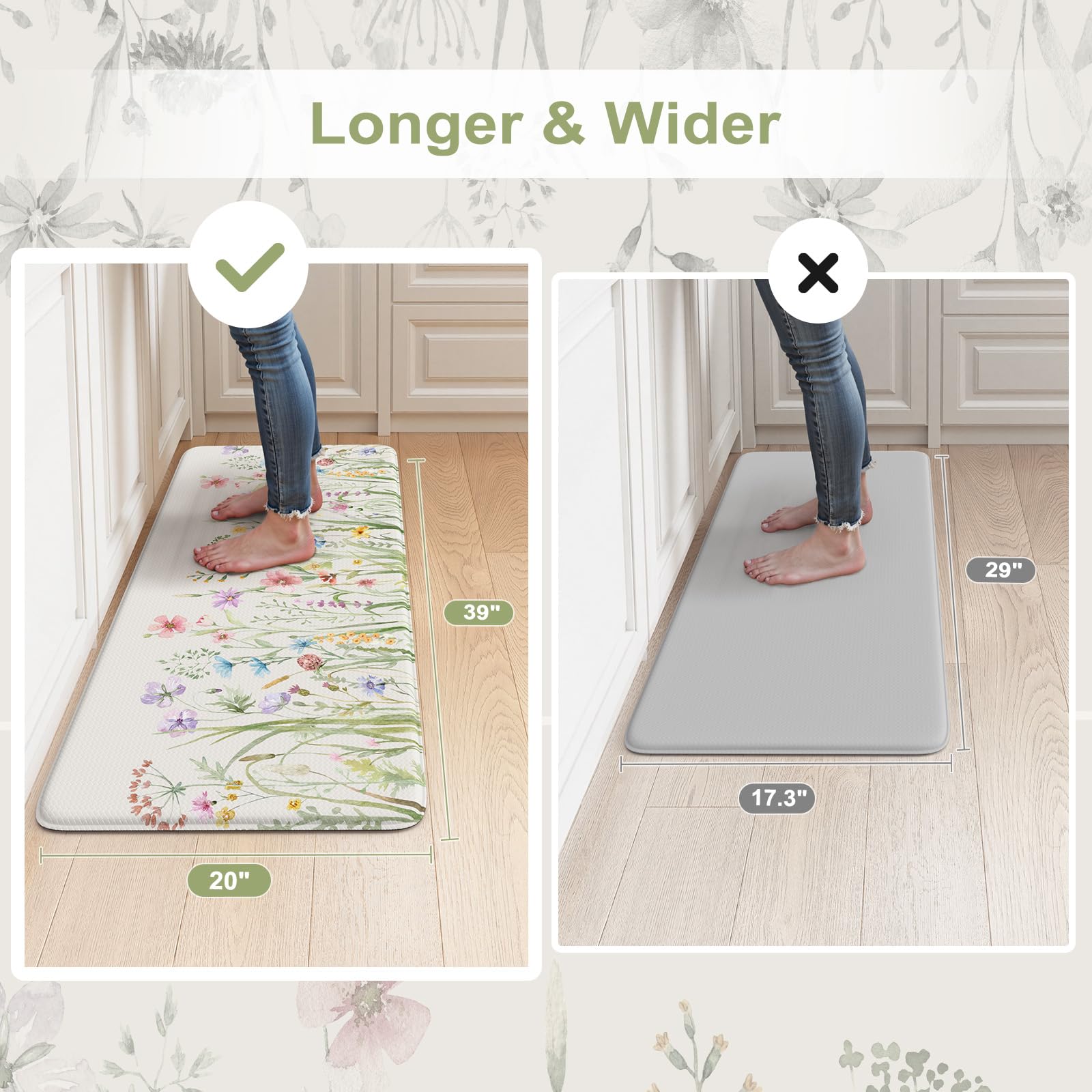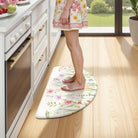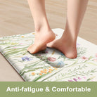- Versatile: Farmhouse style kitchen rug with floral pattern easily to match your kitchen decor, bright your home.Soft thick foam provides ample support for standing in kitchen sink, laundry room, office, bathroom, dinning room, or any other high-traffic area.