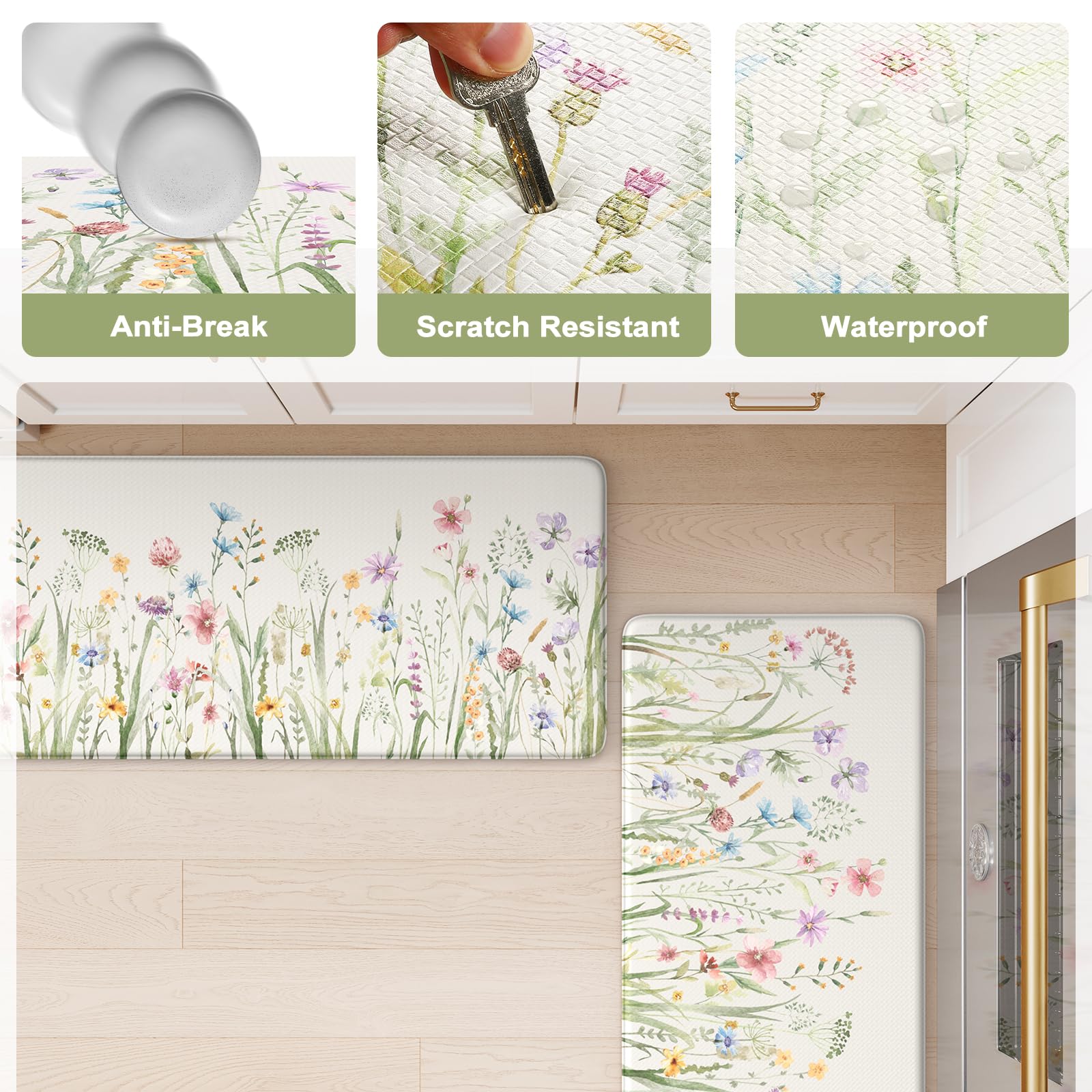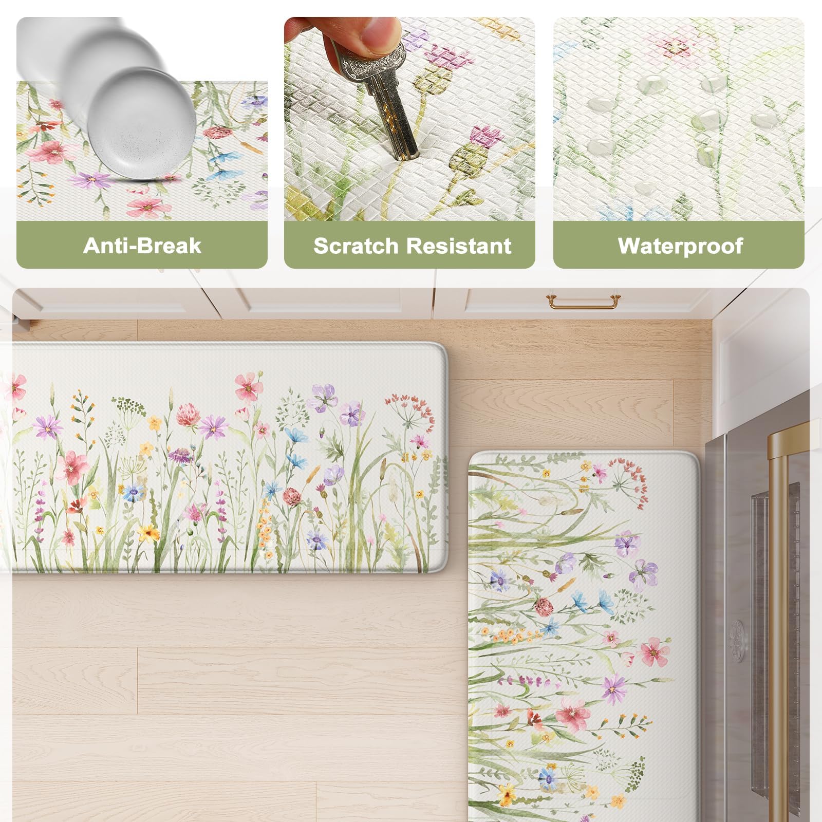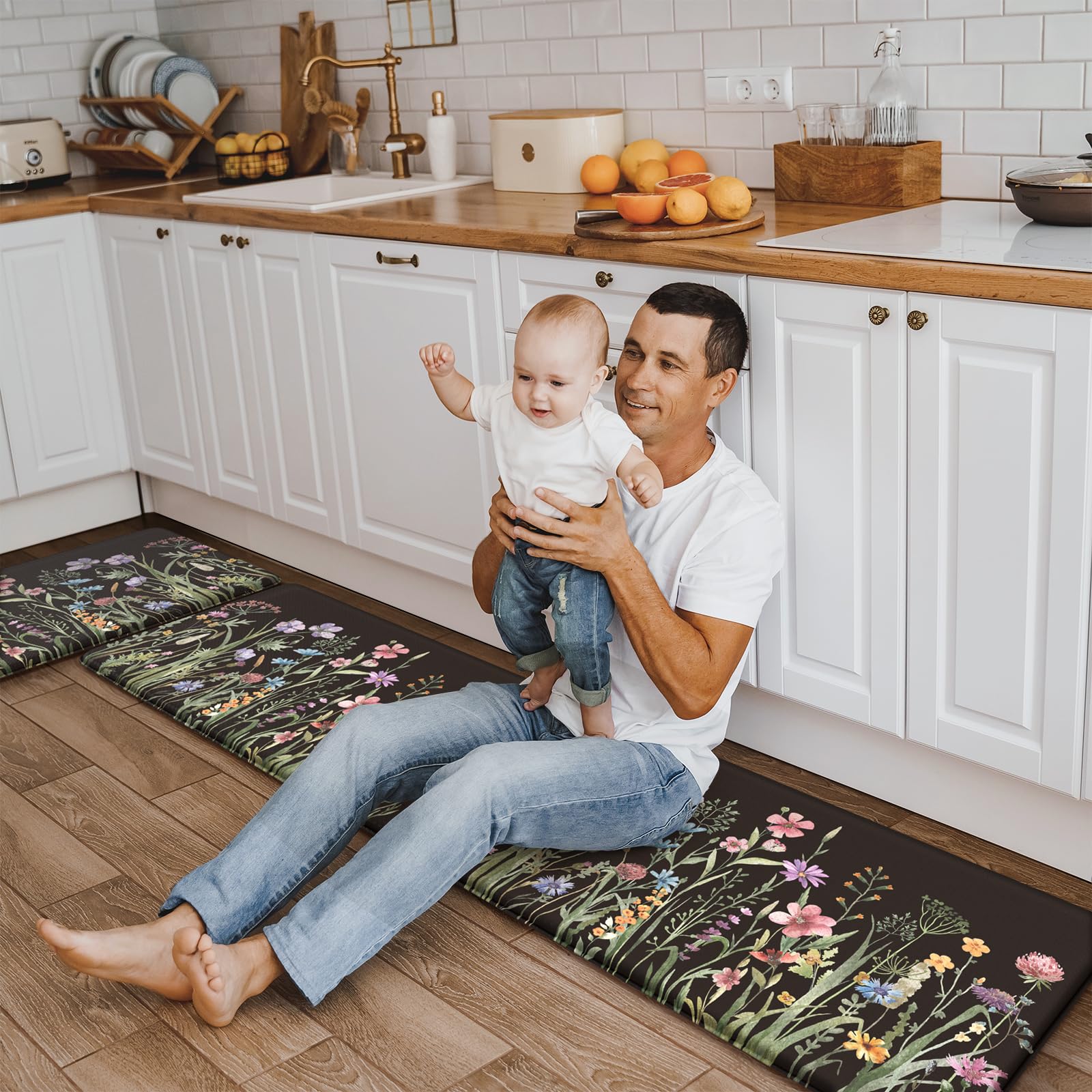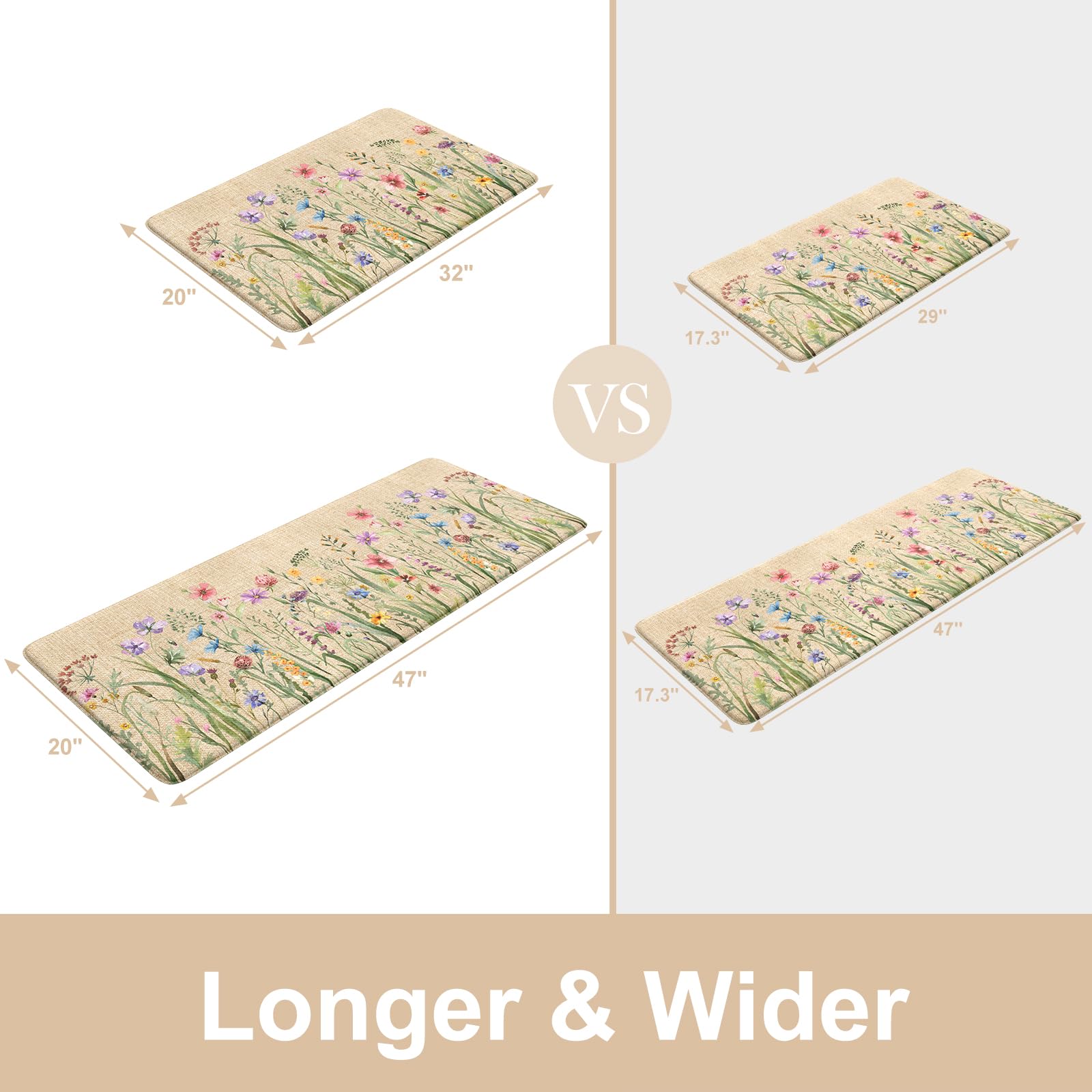 - Versatile: Farmhouse style kitchen rug with floral pattern easily to match your kitchen decor, bright your home.Soft thick foam provides ample support for standing in kitchen sink, laundry room, office, bathroom, dinning room, or any other high-traffic area.