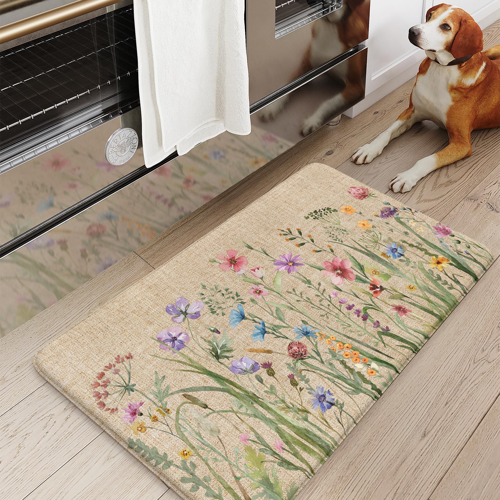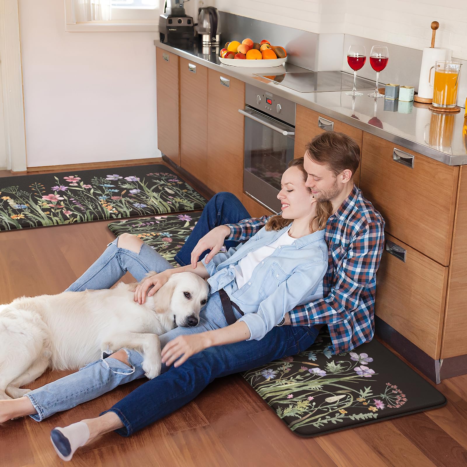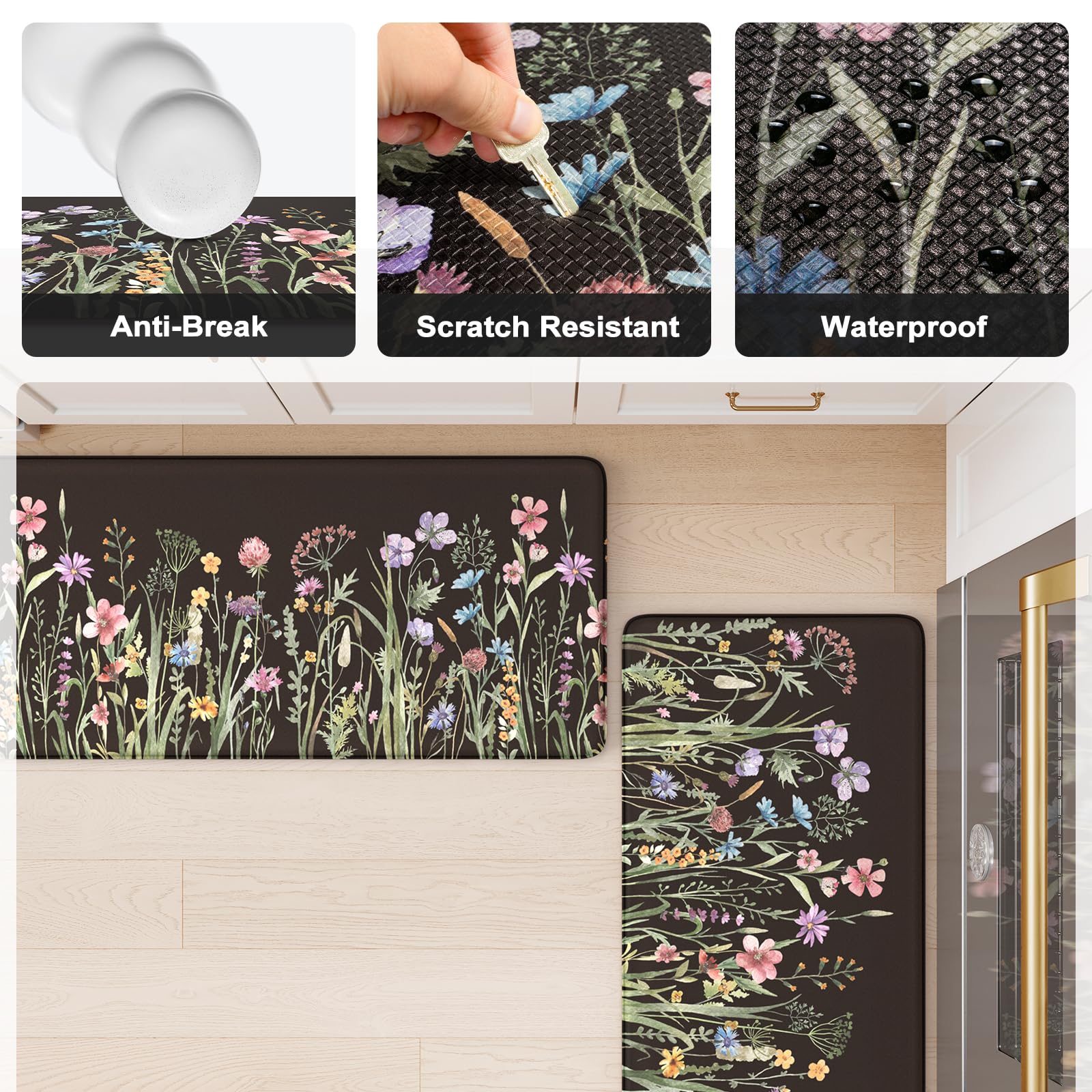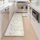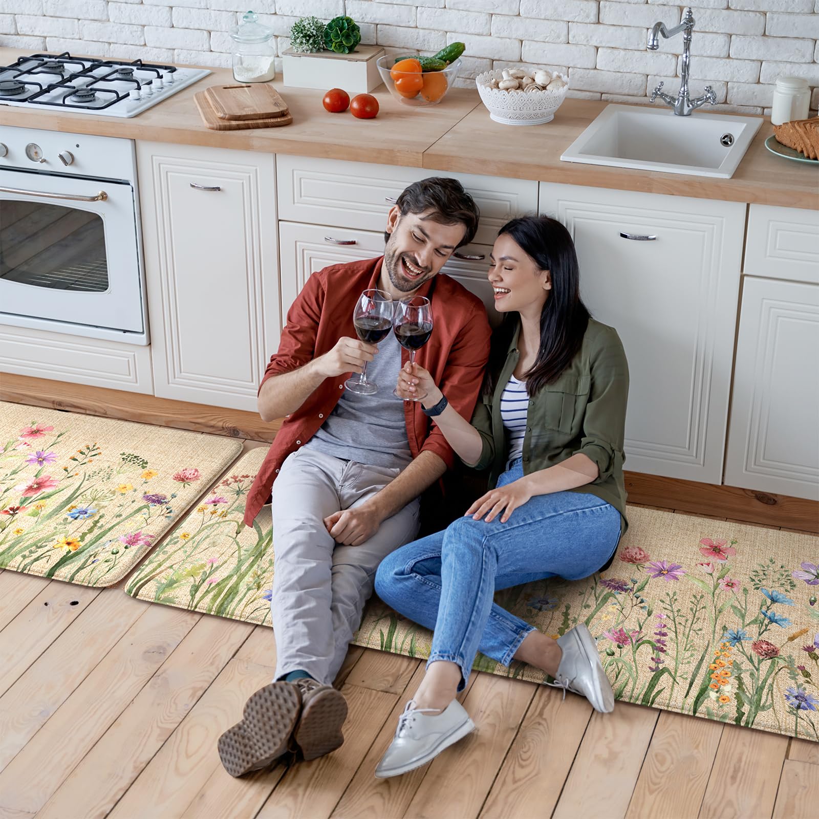 - Versatile: Farmhouse style kitchen rug with floral pattern easily to match your kitchen decor, bright your home.Soft thick foam provides ample support for standing in kitchen sink, laundry room, office, bathroom, dinning room, or any other high-traffic area.