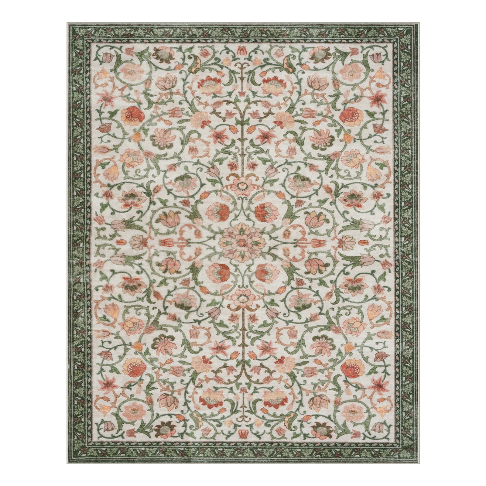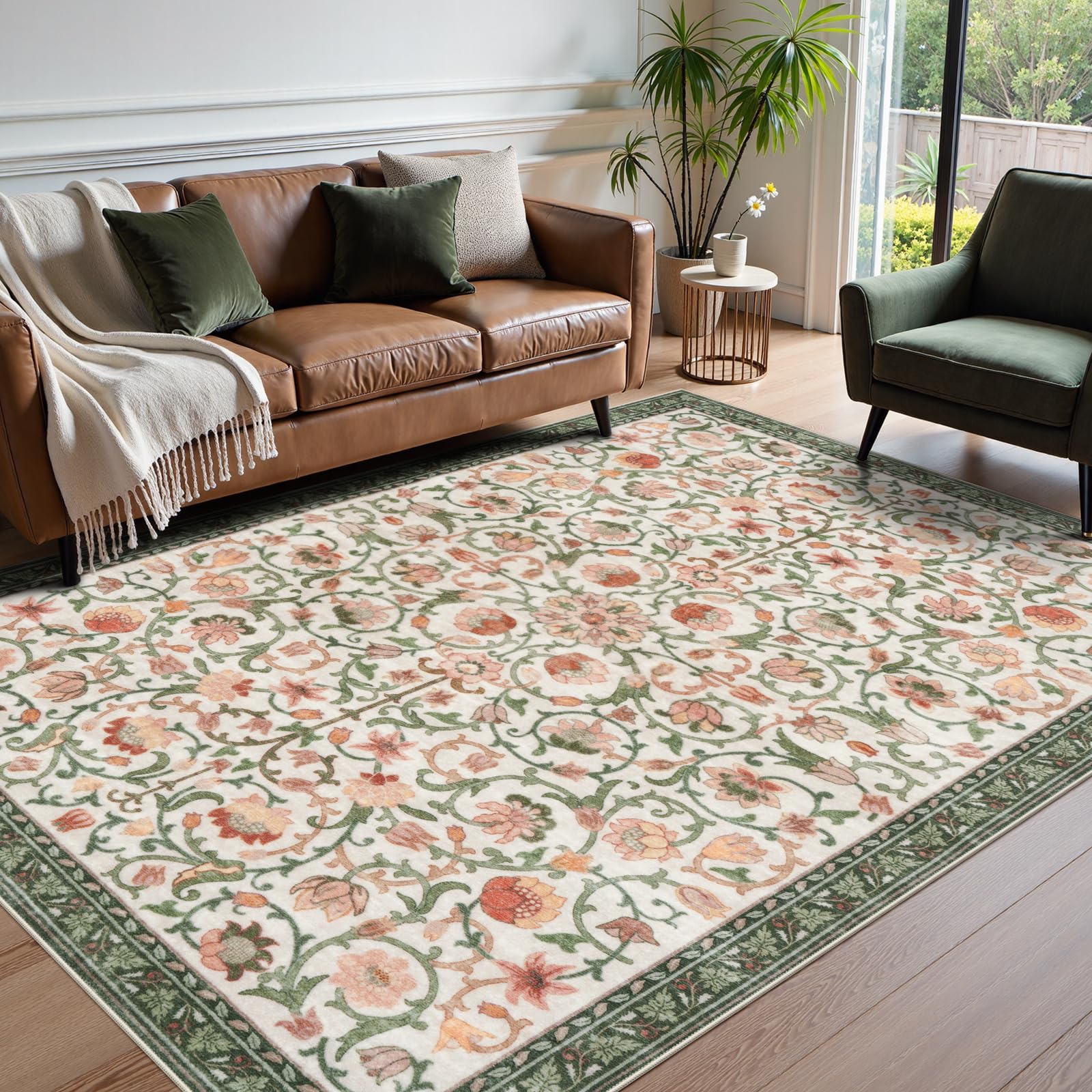 Lahomerug Floral Print Area Rug 5x7, Washable Dark Green Rugs for Living Room, Non Slip Soft Large Rugs for Bedroom, Stain Resistant Dining Room Mat Indoor Floor Carpet for Dorm