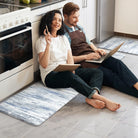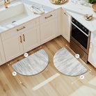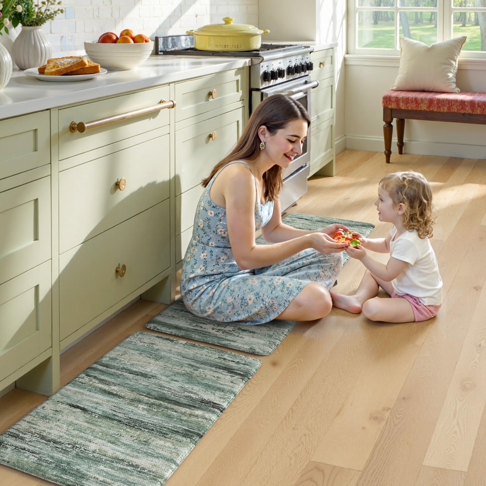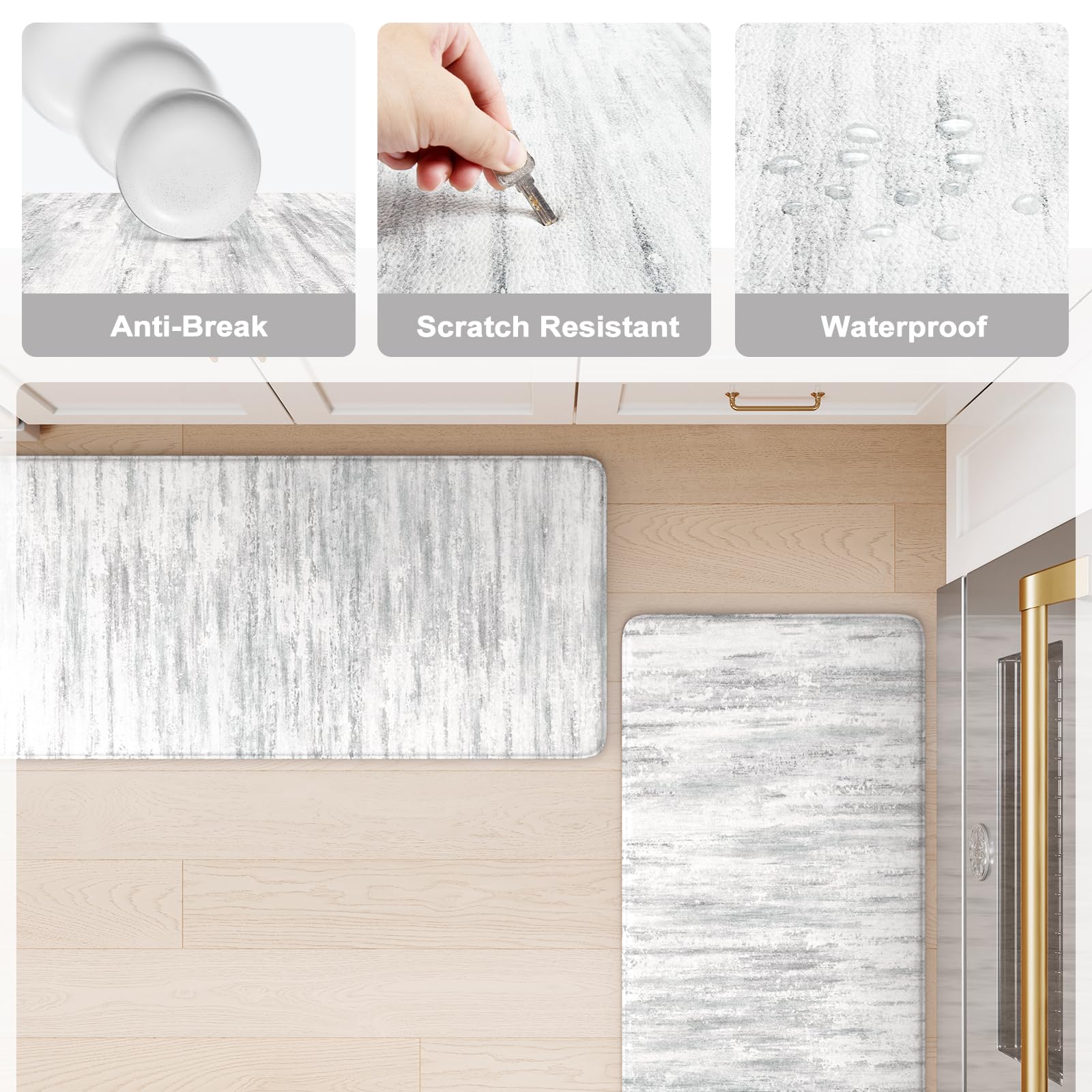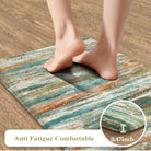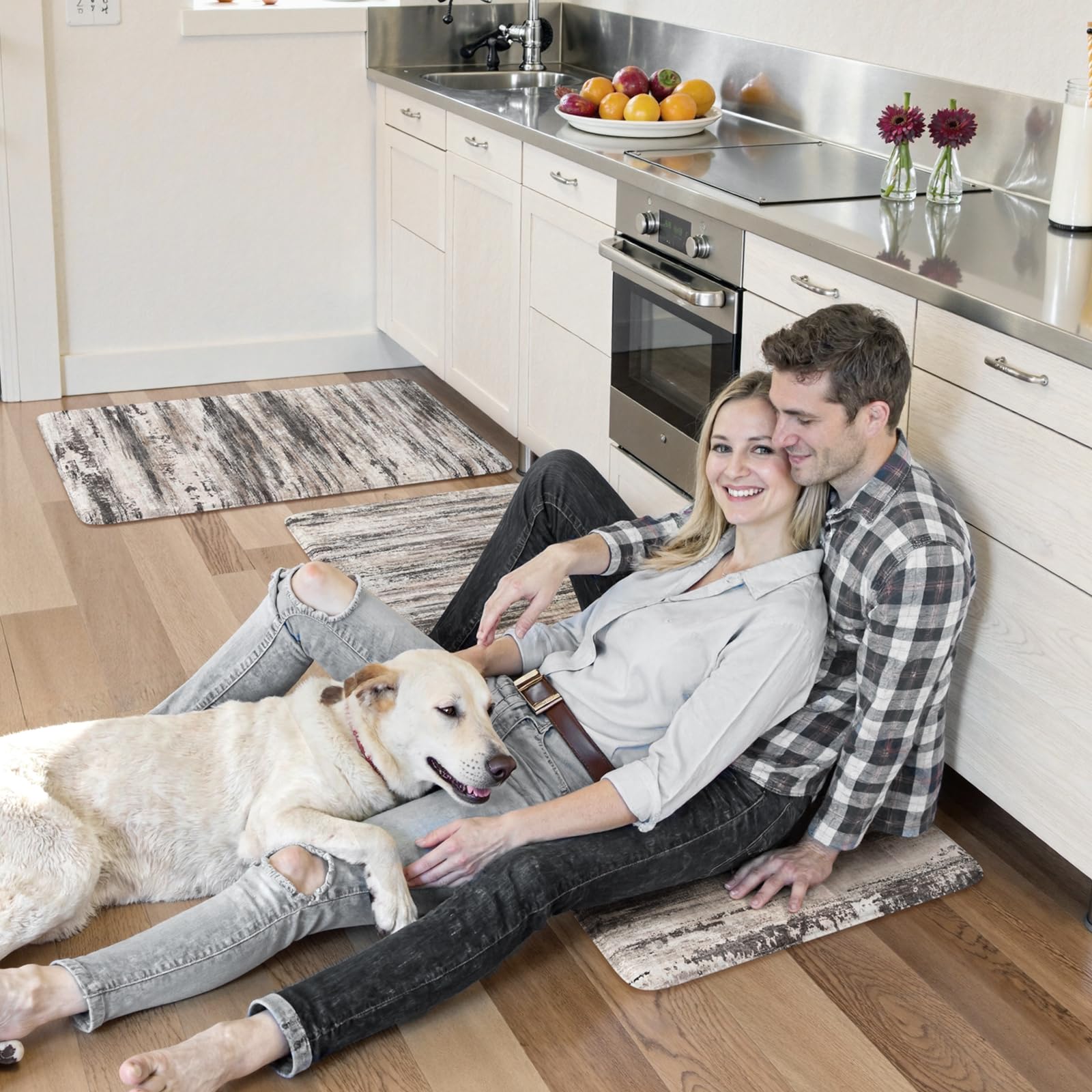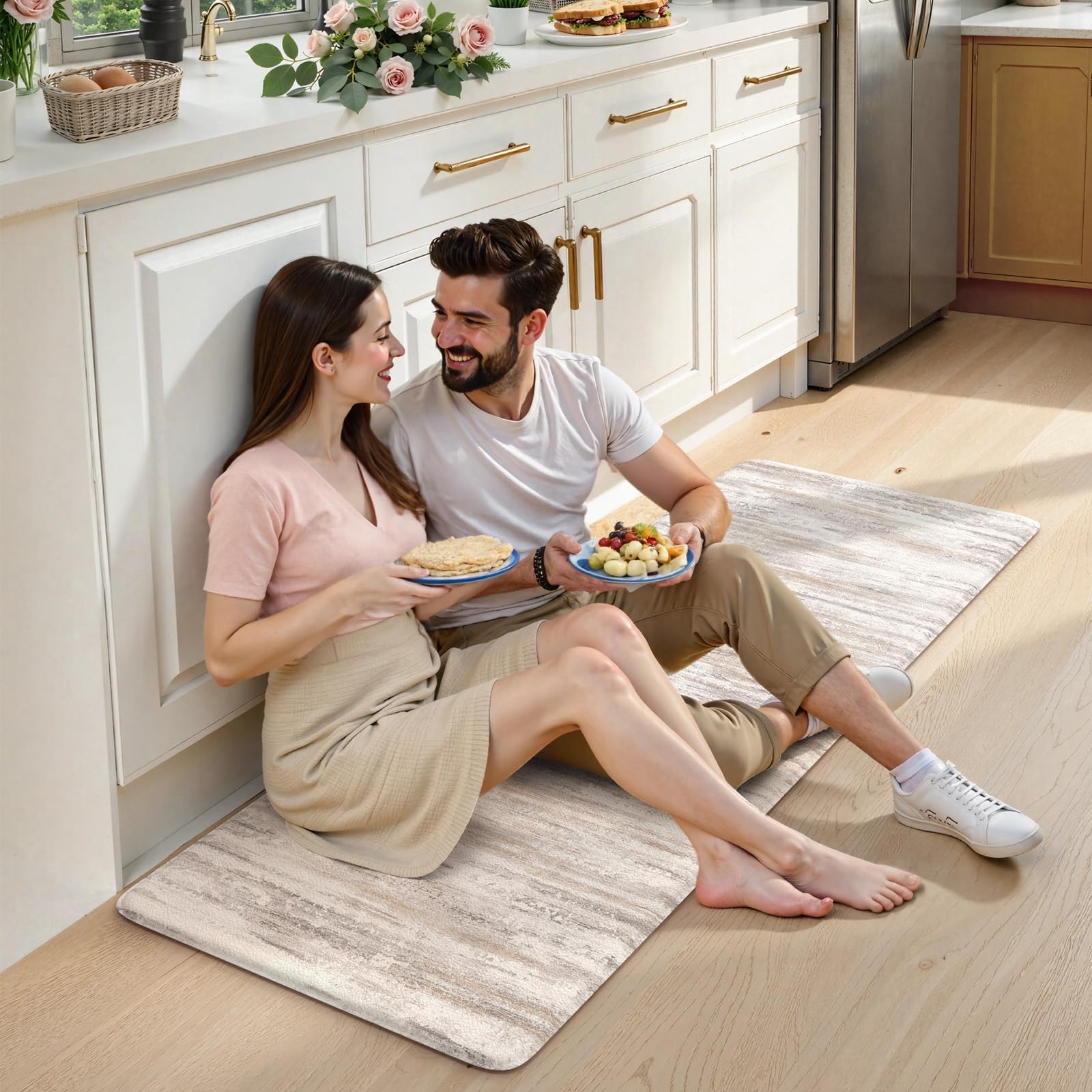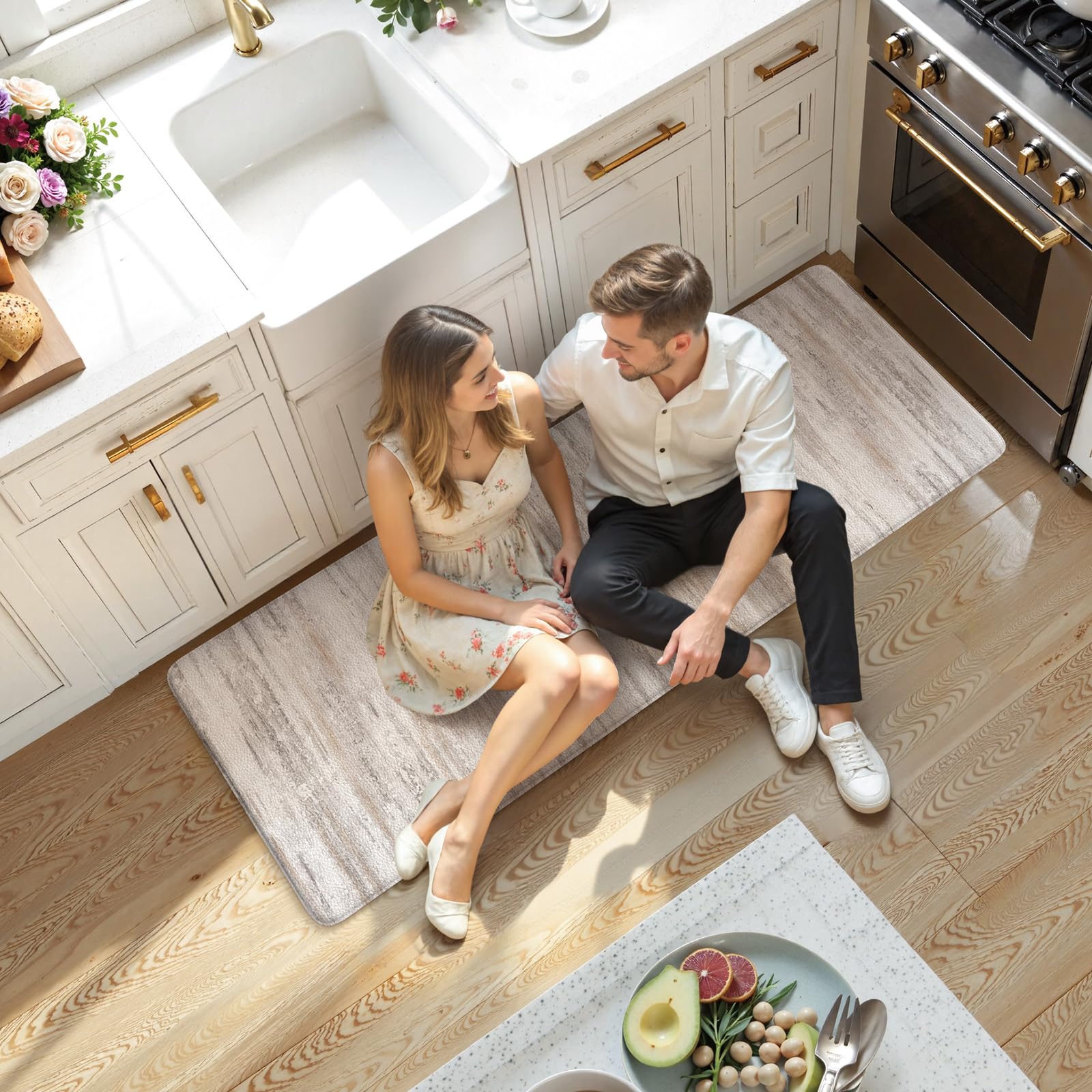 - Comfort Anti-fatigue Kitchen Mats: 0.47inch (12mm) extra thick anti fatigue kitchen floor mat are sure to provide cushion on your feet, knees, lower back, and joints for standing.Feel comfortable like walking on a firm but soft cloud when you are cooking in kitchen or working at your standing desk