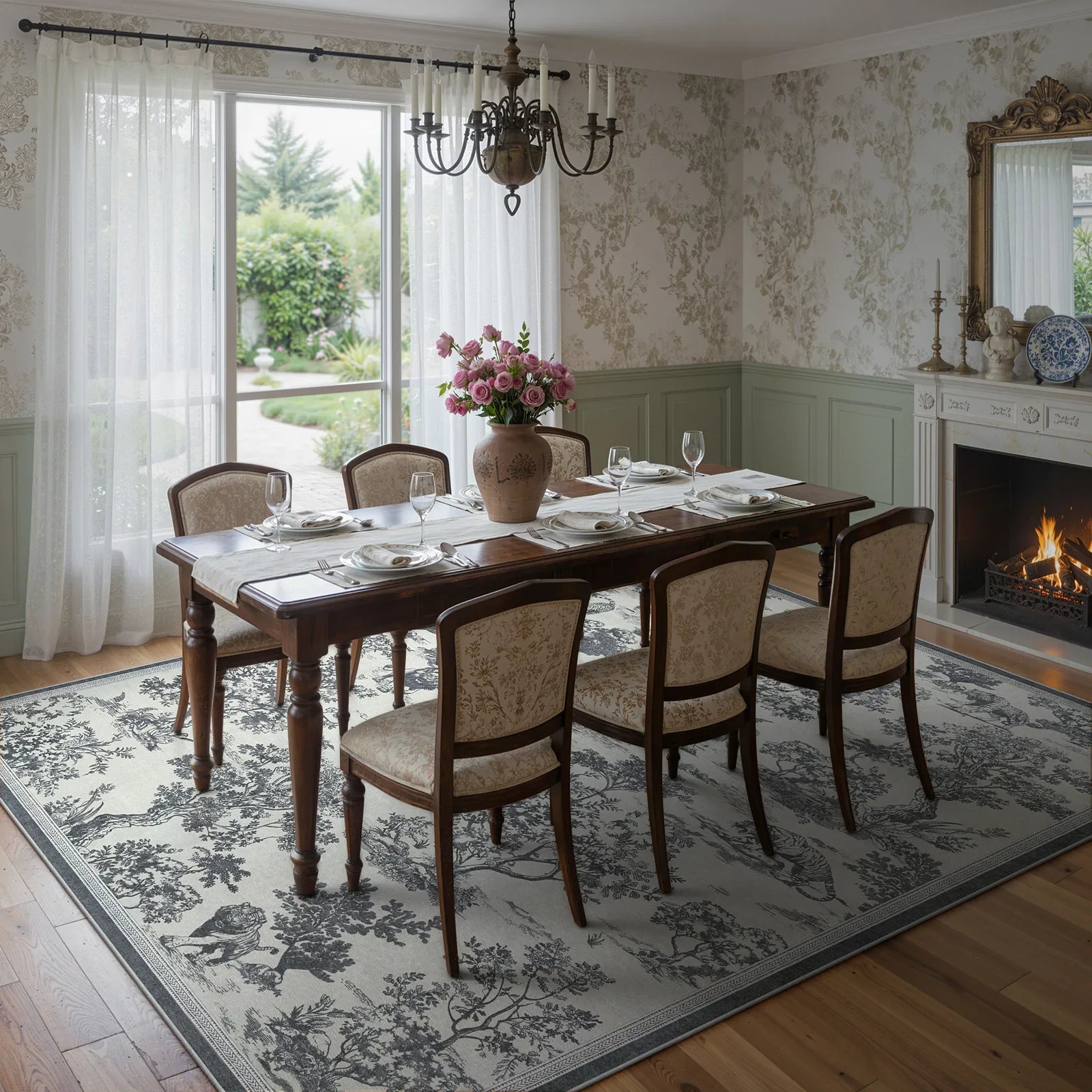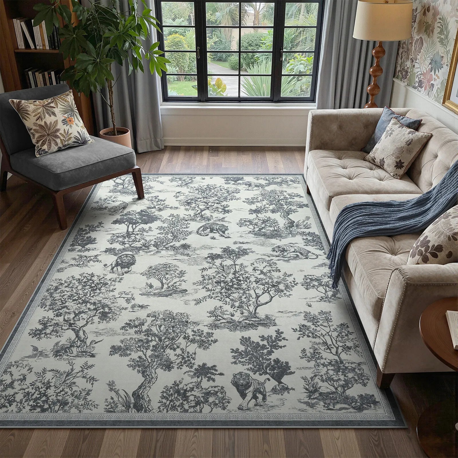 Manoir Washable Vintage Toile Woodland Animal Grey Rug