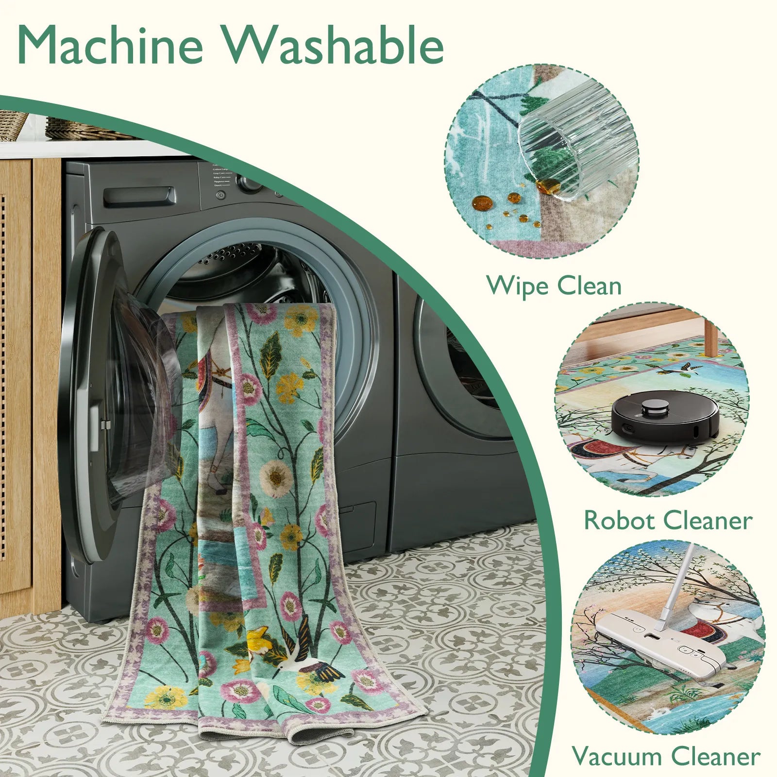 - Our washable rugs are designed to be compatible with most standard washing machines.